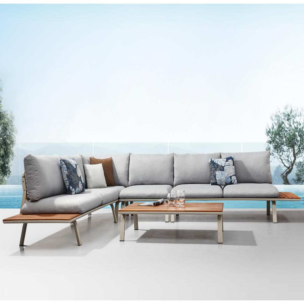 Rahmen aus Aluminium, Tisch und Ablagen aus echtem TeakholzDer Bezug ist abnehmbar und waschbar. Das MAterial ist wasserabweisendes, schnell trocknendes Mikrofaser.