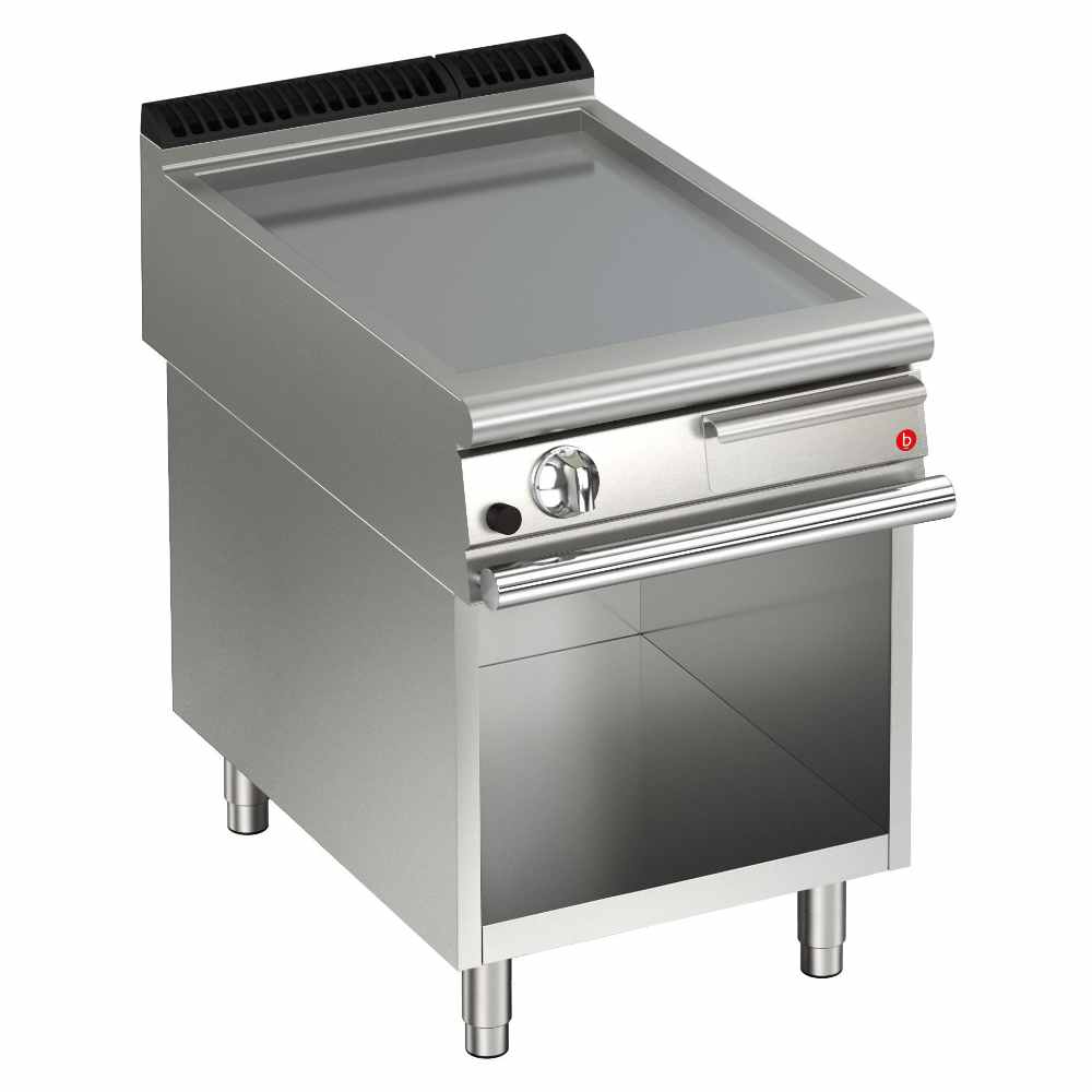 Gas Grillplatte 70/40 Grillfläche glatt 1 Heizzone mit Piezozündung Standgerät mit offenem Unterbau Serie 700Q Leistung: 6,5 kW Maße: 400 x 700 x 870 mm Die Baron Griddleplatten (Gas) der Serie 700Q eignen sich zum Braten großer Mengen bei gleichmäßiger Temperatur. Die Gasmodelle sind mit Gasbrenner mit Piezo-Zündung ausgestattet und regeln von 200 °C bis 400 °C. Die hartverchromten Modelle sind mit einem Thermostatventil zur Regelung der Temperatur im Bereich 100°C bis 280°C ausgestattet. Die abnehmbare Frontblende sorgt für Service-freundlichen Zugriff, die geschwungene Form sowie die ergonomisch schräggestellten Knebel reduzieren Schmutzablagerungen.* Bratfläche 345 x 500 mm