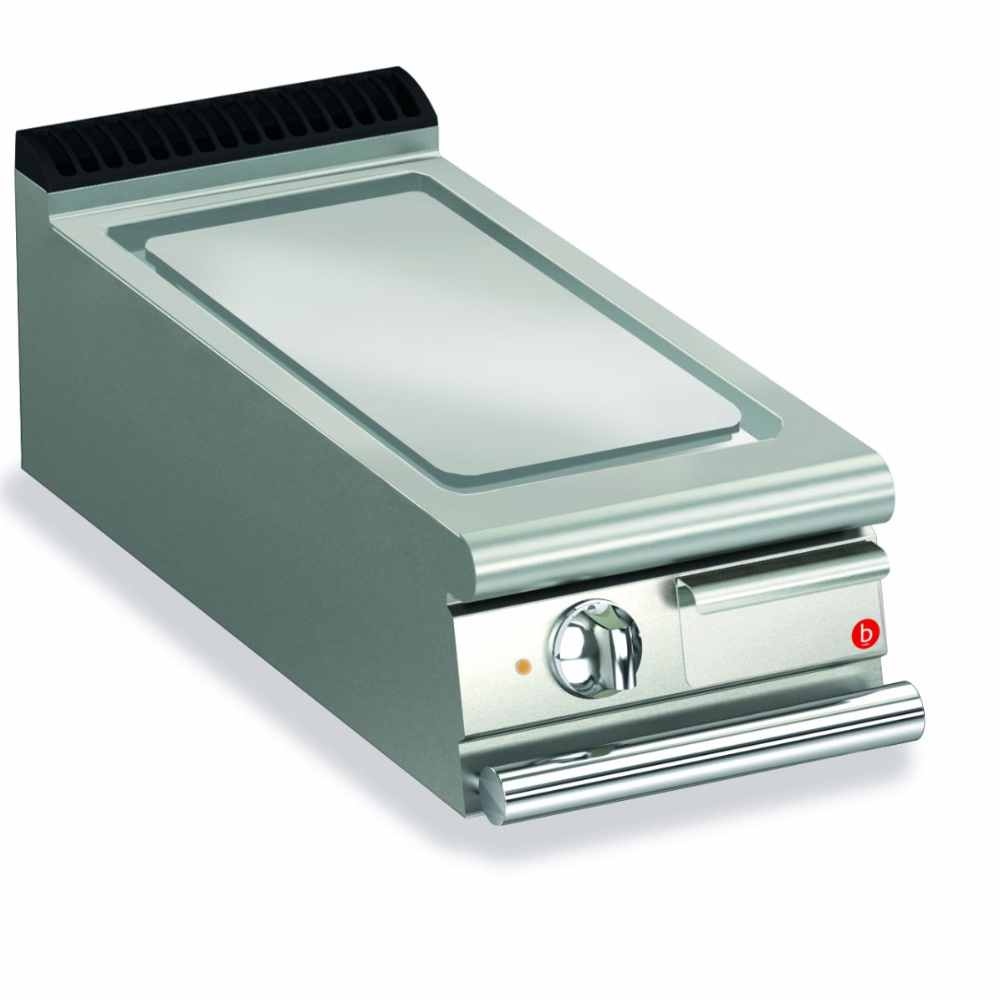 Elektro Grillplatte 70/40 hartverchromt Grillfläche glatt hartverchromt1 HeizzoneStandgerätSerie 700QLeistung: 5,4 kW / 400 VMaße: 400 x 700 x 870 mm Die Baron Griddleplatten (Elektro) der Serie 700Q eignen sich zum Braten großer Mengen bei gleichmäßiger Temperatur. Die Elektromodelle verfügen über gepanzerte Edelstahl-Heizkörper mit erhöhter Leistung. Die hartverchromten Modelle sind mit einem Thermostatventil zur Regelung der Temperatur im Bereich 100°C bis 280°C ausgestattet. Die abnehmbare Frontblende sorgt für Service-freundlichen Zugriff, die geschwungene Form sowie die ergonomisch schräggestellten Knebel reduzieren Schmutzablagerungen.* Bratfläche 345 x 500 mm