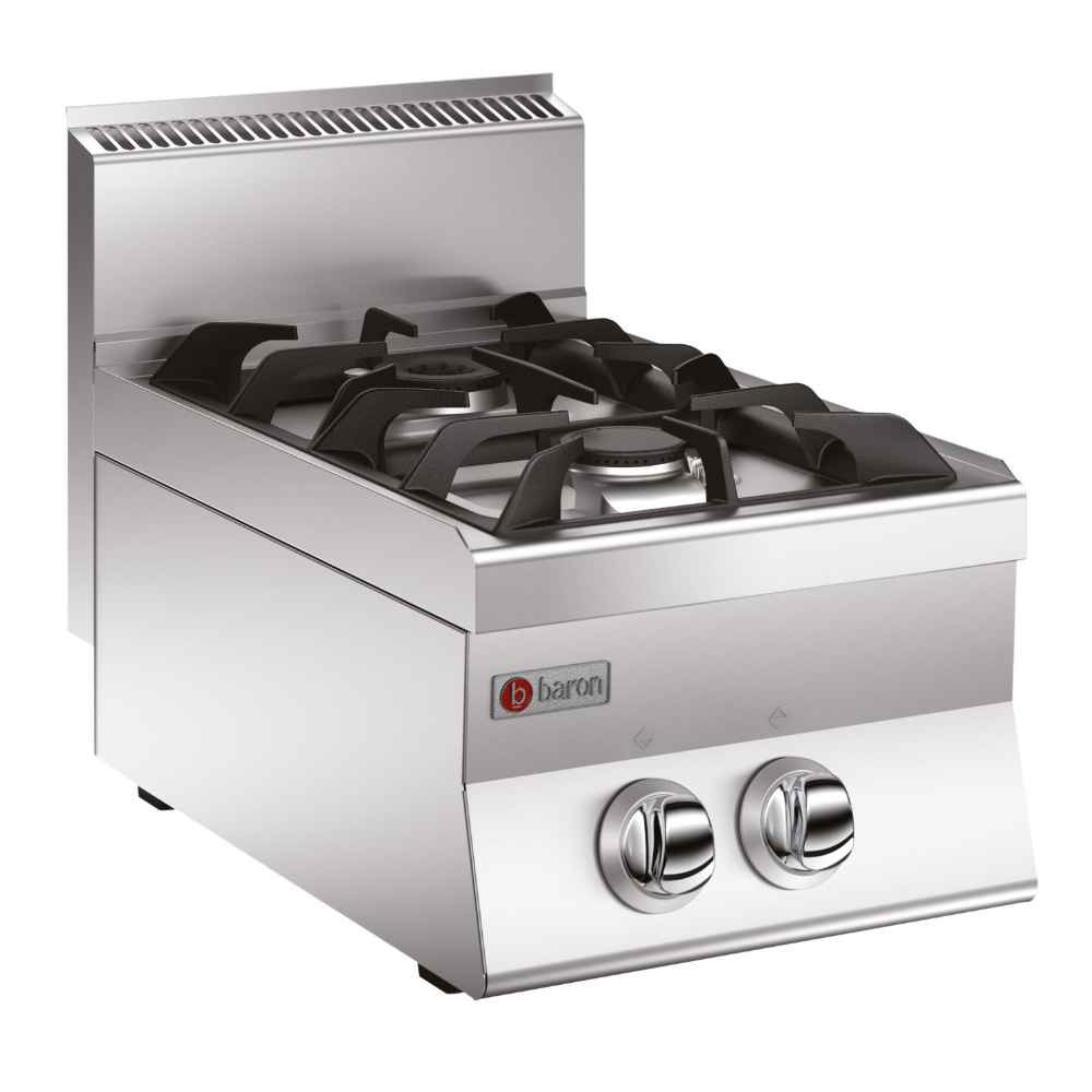 Auftisch Gas-Herd 2 Flammen Brenner: 1 x 3,5 kW + 1 x 7 kW Tischgerät Serie 700Q Leistung: 10,5 kW Maße: 400 x 700 x 250 mm Die Baron Gas-Herde der Serie 700Q sind in sehr vielen Ausführungen erhältlich: als Tischmodell, als Standgerät mit Unterschrank oder als Standgerät mit Backofen. Die Gas-Herde Baron sind mit einer in einem Stück versiegelten und formgepressten Oberplatte ausgestattet. Die abnehmbare Frontblende sorgt für Service-freundlichen Zugriff, die geschwungene Form sowie die ergonomisch schräggestellten Knebel reduzieren Schmutzablagerungen. Die hochleistungsfähigen Brenner bestehen aus Gusseisen (3,5 kW; 5,7 kW und 7,0 kW) und sind alle mit Pilotflamme ausgestattet.