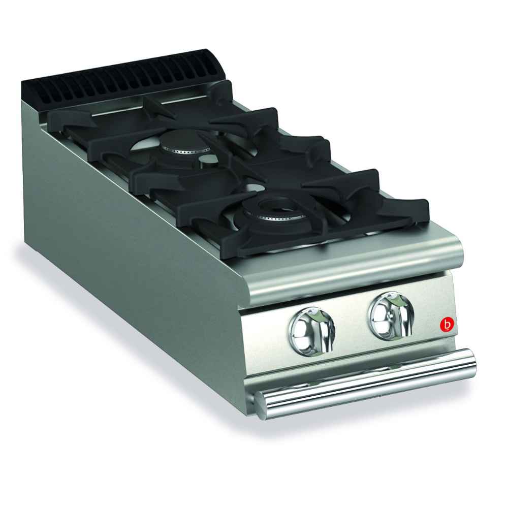 Gas-Herd 2 Flammen Brenner: 1 x 3,5 kW + 1 x 7 kWStandgerät auf offenem UnterbauSerie 700QLeistung: 10,5 kW Maße: 400 x 700 x 870 mm Die Baron Gas-Herde der Serie 700Q sind in sehr vielen Ausführungen erhältlich: als Tischmodell, als Standgerät mit Unterschrank oder als Standgerät mit Backofen. Die Gas-Herde Baron sind mit einer in einem Stück versiegelten und formgepressten Oberplatte ausgestattet. Die abnehmbare Frontblende sorgt für Service-freundlichen Zugriff, die geschwungene Form sowie die ergonomisch schräggestellten Knebel reduzieren Schmutzablagerungen. Die hochleistungsfähigen Brenner bestehen aus Gusseisen (3,5 kW; 5,7 kW und 7,0 kW) und sind alle mit Pilotflamme ausgestattet.