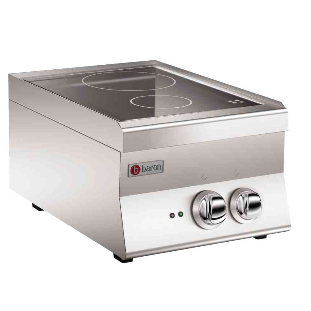 Auftisch Ceran-Herd 5,0 kW 2 Zonen á 2,5 kW Tischgerät Felder: Ø 230 mm, 2 x 2,5 kW Serie 700Q Leistung: 5 kW / 400 V Maße: 400 x 700 x 250 mm Die Baron Ceran-Herde der Serie 700Q haben Kochfelder aus schwer zerbrechlicher, wasserdichter Glaskeramik. Die einzelnen Zonen erbringen eine Leistung von jeweils 2,5kW und sind durch Siebdruck gekennzeichnet. Die Temperatureinstellung von 70°C bis 450°C erfolgt über ein Thermostat. Das Gerät verfügt über Kontrollleuchten zur Anzeige der Aktivierung der Beheizung sowie des Auftretens von Restwärme. Die abnehmbare Frontblende sorgt für Service-freundlichen Zugriff.* mit Restwärmeanzeige* Felder: 2,5 kW Ø230 mm* Temperaturbereich 70°C - 450°C