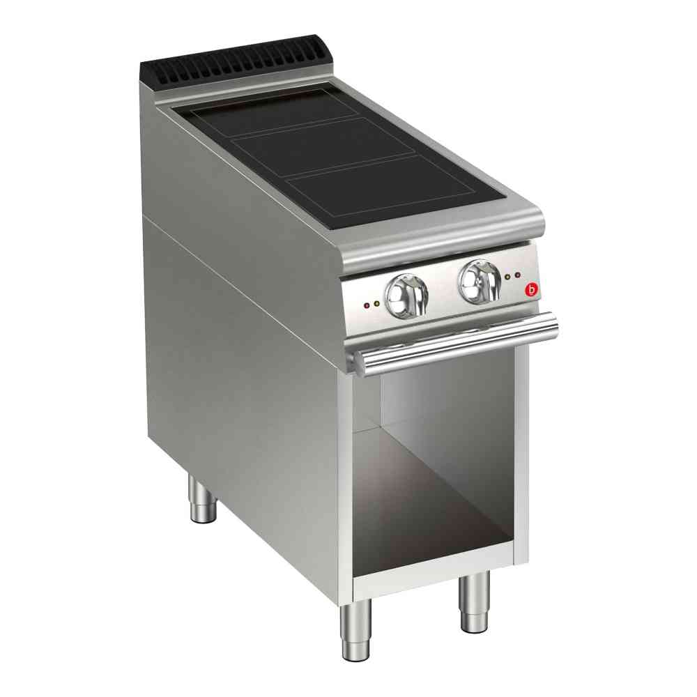 Induktions-Herd 2 Zonen 7kW Je Heizzonen 3,5 kW Standgerät mit offenem Unterbau Serie 700Q Leistung: 7,0 kW | 400 V Maße: 400 x 700 x 870 mm Die Baron Induktionsherde der Serie Q700 haben Kochfelder aus schwer zerbrechlicher, wasserdichter 6mm Glaskeramik. Die einzelnen Kochzonen sind durch Siebdruck gekennzeichnet. Die Leistung eines einzelnen Kochfelds beträgt 3,5 kW bzw. 5,0 kW. Das Gerät verfügt außerdem über eine Kombi-Kontrollleuchte zur Anzeige der Aktivierung der Beheizung und der Fehlercodeausgabe. Die abnehmbare Frontblende sorgt für Service-freundlichen Zugriff, die geschwungene Form sowie die ergonomisch schräggestellten Knebel reduzieren Schmutzablagerungen. Sonderbauten bzw. Der am Herd vorne angebrachte Handlauf verringert die Anstoßgefahr, schützt die Bedienknöpfe und sichert den richtigen Abstand zur Kochfläche. Sie bietet Platz zum Ablegen von Geschirrtüchern und allem, was man griffbereit zur Hand haben muss. Sonderbau auf Anfrage möglich.* Topfleererkennung* Fehlercodeausgabe über Blinkcode