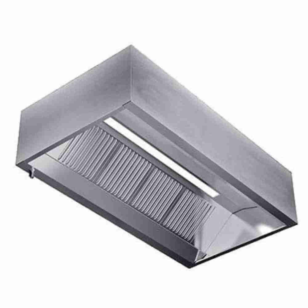 VDI-Wandhaube in Kastenform 2000mm Kastenhaube vollverschweißt,Rundumlaufende Fettauffangrinne mit FettablasshahnFlammschutzfilter Typ ABeleuchtung hinter Glas (IP65)ohne Stutzen und MotorMaße: 2000 x 1000 x 450 mm
