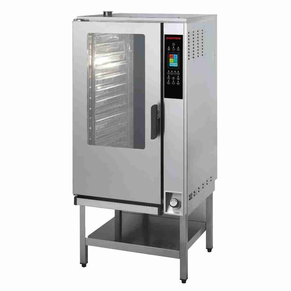 Kombidämpfer Gas ohne Reinigungssystem11 x GN1/1 EinschubDirektdampferzeuger im GarraumTemperaturbereich 50 - 270 °CMaße: 800 x 800 x 1100 mmLeistung: 12,0 kWElektro-mechanische SteuerungBetriebsarten: Dampf / Heißluft / KombiTür mit Doppelverglasung (Anschlag links)Abstand zwischen den Blechen 67 mmXT-Force-SystemDie professionellen Inoxtrend Gas-Kombidämpfer für die Gastronomie mit GN-Längseinschub. Der Garraum aus CSN 18/10 hat abgerundete Innenkanten zur einfachen Reinigung. Die Geräte verfügen über eine Direktdampferzeugung mit regelbarer Dampfmenge. Die Tür hat eine Doppelglasscheibe, die Innenscheibe ist zur einfachen Reinigung auf Scharnieren schwenkbar.